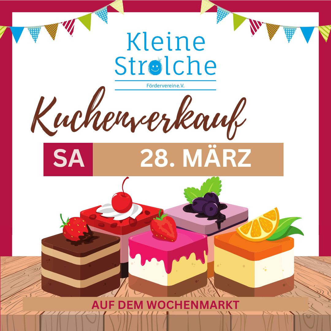 Am Samstag, 28. März ist es wieder so weit: Der Förderverein unserer Kita Deininger Mauer „kleine Strolche e.V.“ bietet auf dem Wochenmarkt liebevoll selbst gebackene Kuchen an. Kommt vorbei, nehmt euch leckeren Kuchen für den Kaffee zu Hause mit und unterstützt dabei unsere Kindertagesstätte! Die „Kleinen Strolche“ freuen sich auf euch!