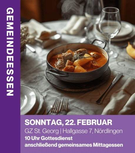 Wir laden die ganze Gemeinde herzlich zum gemeinsamen Mittagessen ein. Lassen Sie am 22.02.2026 den Herd zu Hause aus und genießen Sie die Zeit mit anderen an einem fertig gedeckten Tisch. Ohne Anmeldung, einfach Platz nehmen. direkt nach dem Gottesdienst.