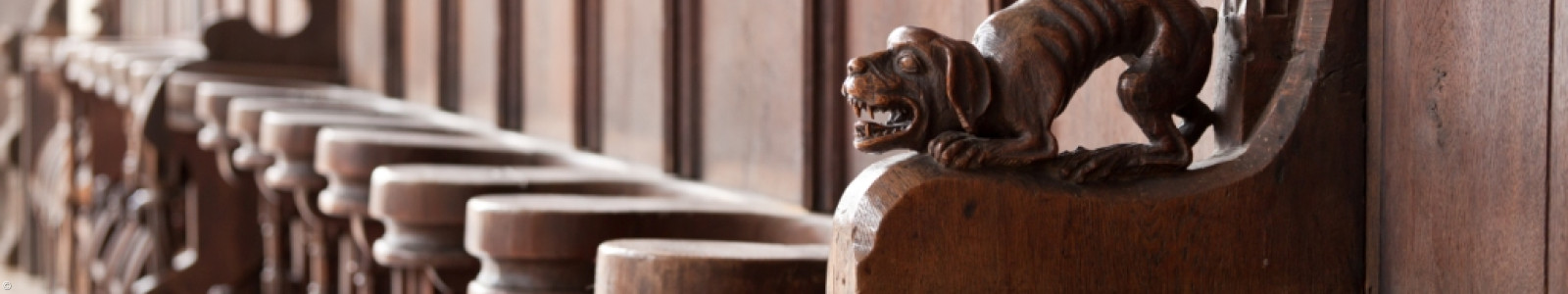 Auf dem Weg vom alten Altarschrein zum Sakramentshäuschen an der östlichen Chorwand des nördlichen Seitenschiffs, schreiten wir am Originalgestühl der Kirche vorbei. Diese stammen aus dem Jahre 1490 und zeigen Schnitzereien aus dem irdischen und biblischen Leben, sowie Fabelwesen. Die Sitzbank des Gestühls kann nach oben geklappt werden. Auch dann bleibt ein kleiner Sitzschemel erhalten. Dieser diente den damaligen Besuchern der Gottesdienste als Stütze, denn die Messen wurden damals im Stehen abgehalten und dauerten z.T. bis zu drei Stunden.