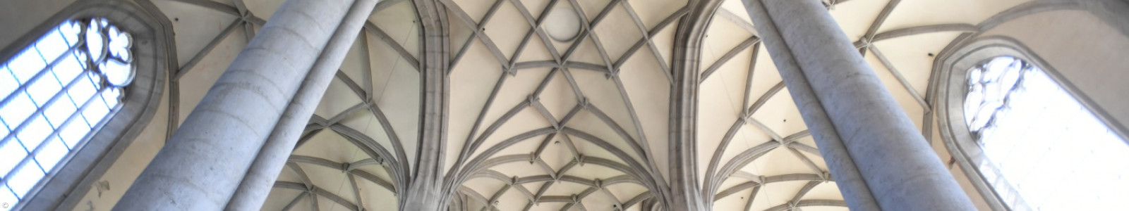 Vor dem Volksaltar kann man sich einen guten Überblick über die wesentlichen Kunstwerke der Kirche verschaffen. Im Westen befindet sich die mächtige Empore mit der Hauptorgel, an der Nordwand erblicken Sie die beiden in den Kirchenraum harmonisch eingefügten Kapellen, zahlreiche Epitaphien und Totenschilde sowie den spätgotischen Altarschrein von 1462. Im Osten erkennen Sie den Hochaltar mit seinen bedeutenden Figuren und das Chorgestühl. An der Südwand wird die strenge Raumgliederung durch die Seitenorgel aufgelockert. Direkt vor Ihnen befindet sich die Kanzel mit ihren zahlreichen Plastiken und dem barocken Schaldeckel.